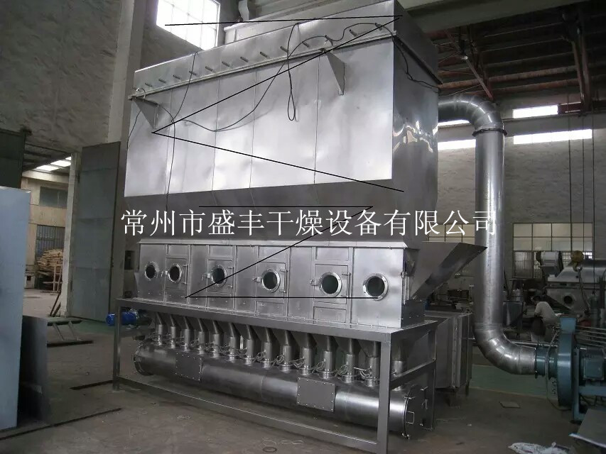 沸腾干燥机干燥过程是将热气流以一定的速度从沸腾干燥器的多孔分布板底部送入,均匀地通过物料层,物料颗粒在气流中悬浮,上下翻动状态,气固之间接触面积很大,传质和传热速率显著增大,使物料迅速、均均地得到干燥。干燥器外形为长方形,器内用挡板分隔成多个室,由于热空气分别通到各室内,可以根据各室含水量的不同来调节需用的热空气量,使各室的干燥程度保持均衡。主要用于处理颗粒状物料。