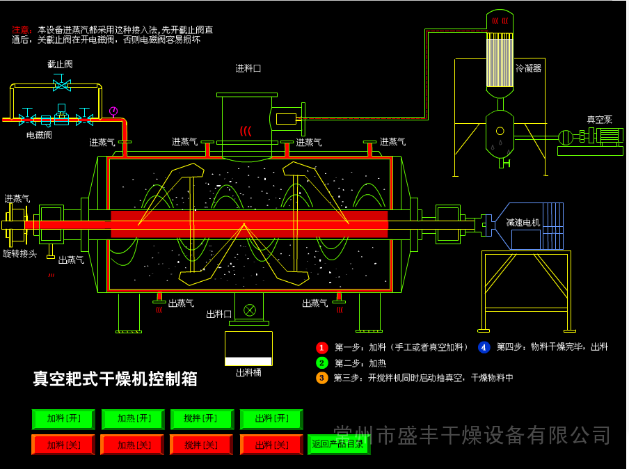 6.易于操作 真空耙式干燥机操作方便,定员少,劳动强度低。由于物料外逸损失减小,改善了环境卫生。 -